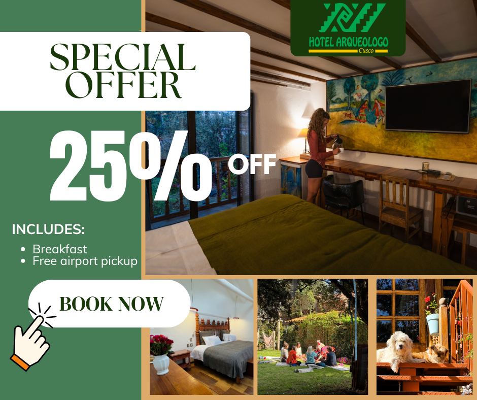 Estamos a 3400 metros de altura. Tenemos 22 habitaciones que mezclan toques tradicionales y modernos, con tamaños de 15 a 27 m². 15 minutos del aeropuerto del cusco. El estacionamiento en el mismo lugar que el hotel pero tiene un acceso diferente (de 7h00 Am hasta 21h30 Pm y solo funciona con reserva. (Contamos con Un restaurante y un bar en mantenimiento).